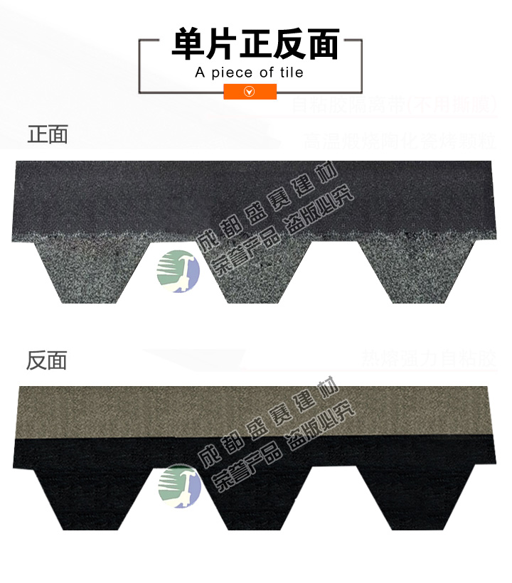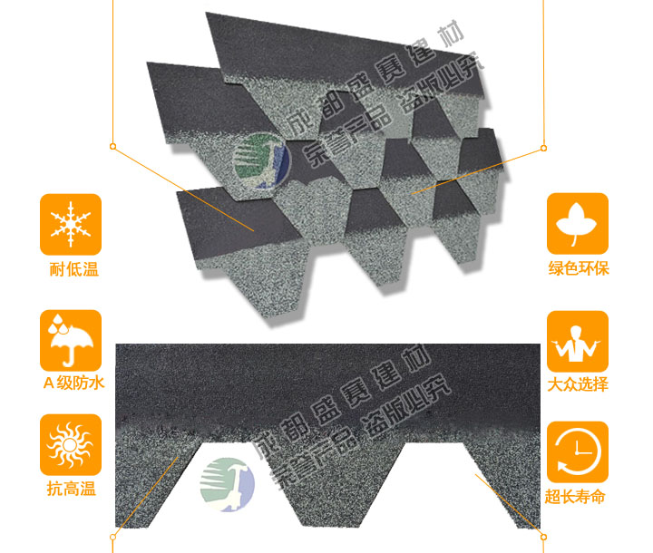 本款产品颜色丰富,立体感强,一般适用于广泛应用于高档别墅、高档小区、政府安置工程,学校工程等工程,产品可自由裁剪,能成功覆盖于不同形状和不同基层的屋顶。适用屋面坡度从15°到90°不同建筑。