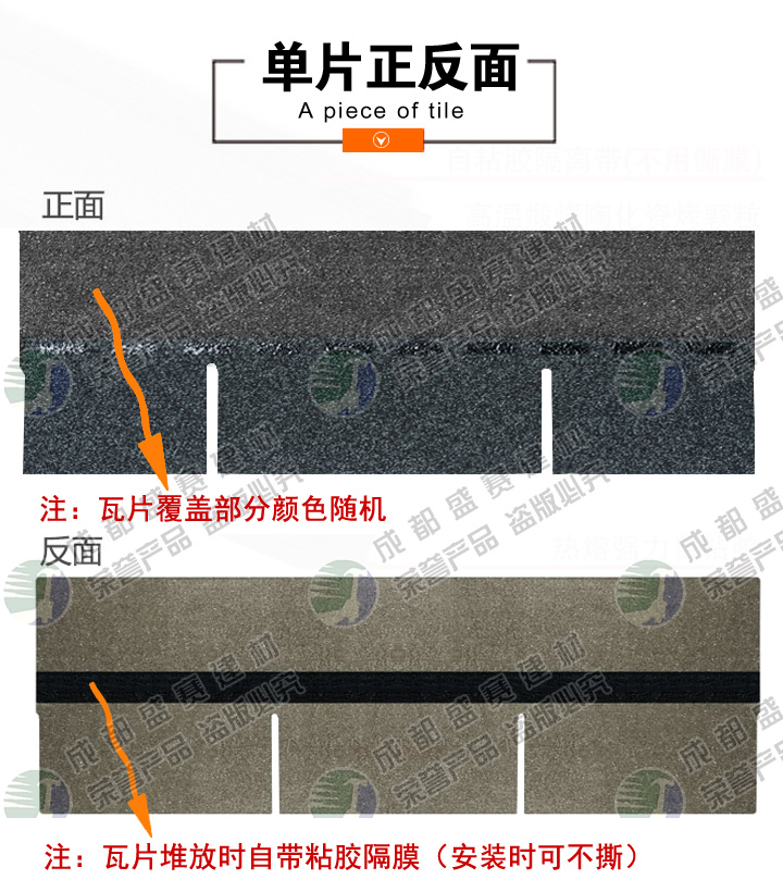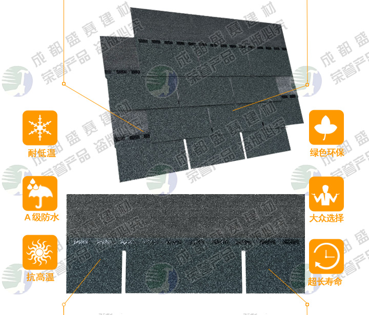 本款产品颜色丰富,立体感强,一般适用于广泛应用于高档别墅、高档小区、政府安置工程,学校工程等工程,产品可自由裁剪,能成功覆盖于不同形状和不同基层的屋顶。适用屋面坡度从15°到90°不同建筑。