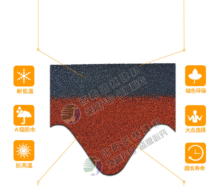 本款产品颜色丰富,立体感强,一般适用于广泛应用于高档别墅、高档小区、政府安置工程,学校工程等工程,产品可自由裁剪,能成功覆盖于不同形状和不同基层的屋顶。适用屋面坡度从15°到90°不同建筑。