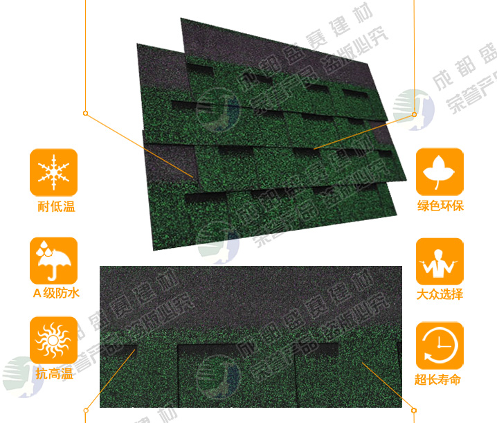 产品特点本款产品颜色丰富,一般适用于广泛应用于高档别墅、高档小区等工程,产品可自由裁剪,能成功覆盖于不同形状和不同基层的屋顶。适用屋面坡度从15°到90°不同建筑。