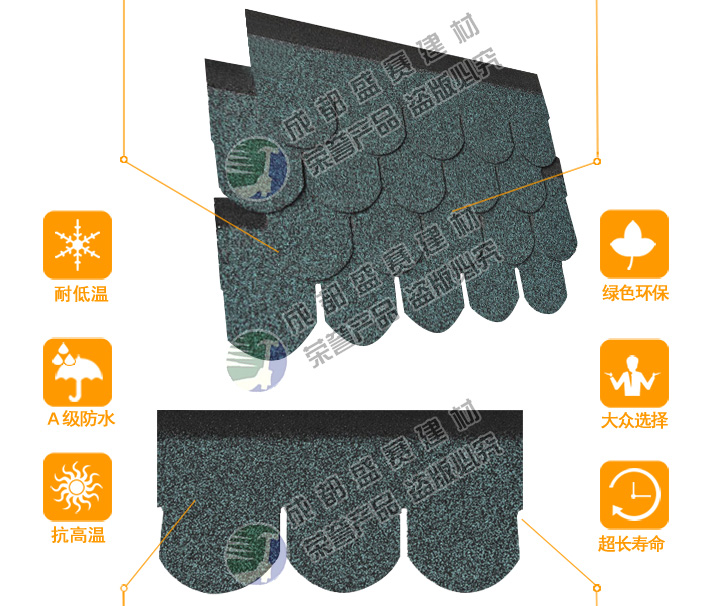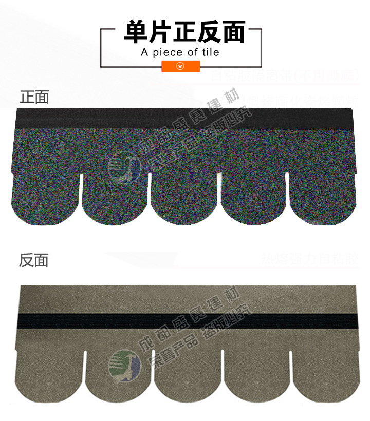 本款产品颜色丰富,安装效果细腻,立体感强,一般适用于广泛应用于高档别墅、高档小区、尖塔等工程,产品可自由裁剪,能成功覆盖于不同形状和不同基层的屋顶。适用屋面坡度从15°到90°不同建筑。