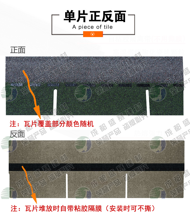 本款产品颜色丰富,立体感强,一般适用于广泛应用于高档别墅、高档小区、政府安置工程,学校工程等工程,产品可自由裁剪,能成功覆盖于不同形状和不同基层的屋顶。适用屋面坡度从15°到90°不同建筑。