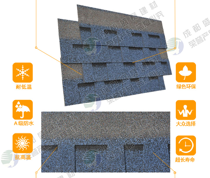 本款产品颜色丰富,一般适用于广泛应用于高档别墅、高档小区等工程,产品可自由裁剪,能成功覆盖于不同形状和不同基层的屋顶。适用屋面坡度从15°到90°不同建筑。